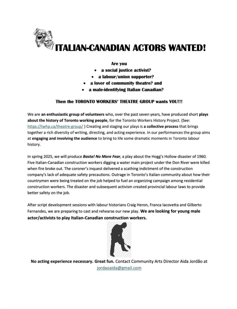 I am co-writing a play with Craig Heron and Franca Iacovetta about the Hogg’s Hollow tragedy of 1960, called Basta! No More Fear, which is being produced by the Toronto Workers History Project’s theatre group. We are currently seeking young male actors to play Italian immigrant construction workers. See flyer below for more.